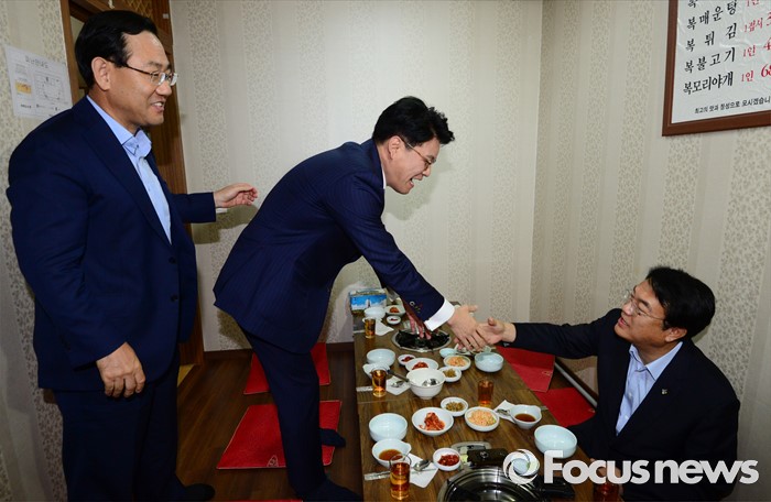 (서울=포커스뉴스) 정진석(오른쪽부터) 새누리당 원내대표가 29일 오후 서울 여의도 한 음식점에서 열린 복당 의원들과의 오찬에 참석해 장제원, 주호영 의원과 인사하고 있다.