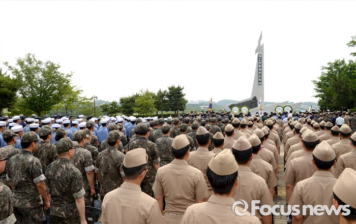 (서울=포커스뉴스) 29일 경기 평택시 해군2함대사령부에서 열린 제2연평해전 14주년 기념행사에 제2연평해전 유가족, 참수리 357호정 장병 및 가족, 연평재단, 추모본부 관계자, 참전 주요 지휘관, 함대 장병 등 500여명이 기립하고 있다.<사진제공=해군>