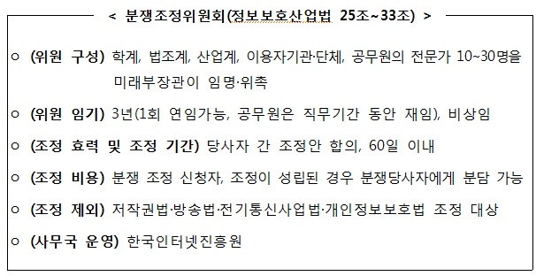 위원회는 이날 공식 출범에 앞서 1차 회의를 열어 홍준형 서울대 교수를 위원장으로 선출했다.분쟁조정위원회 관련 정보보호산업법 조항.<표제공=미래부>
