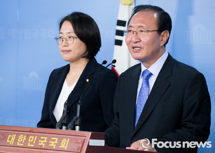 (서울=포커스뉴스) 29일 오후 서울 여의도 국회 정론관에서 미래창조과학방송통신위원회 재배정을 요구하며 농성에 들어갔던 추혜선(왼쪽) 정의당 의원과 노회찬 원내대표가 농성을 해제하고 외교통일위원회 배정을 받아들이는 내용의 기자회견을 하고 있다.