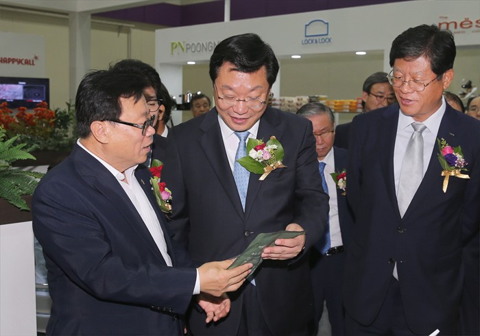 (서울=포커스뉴스) 주형환(가운데) 산업통상자원부 장관과 이동필(왼쪽) 농림축산식품부장관이 29일 서울 강남구 삼성동 코엑스에서 열린 2016 대한민국 소비재 수출대전에 참석해 전시물을 둘러보고 있다. <사진제공=산업통상자원부>