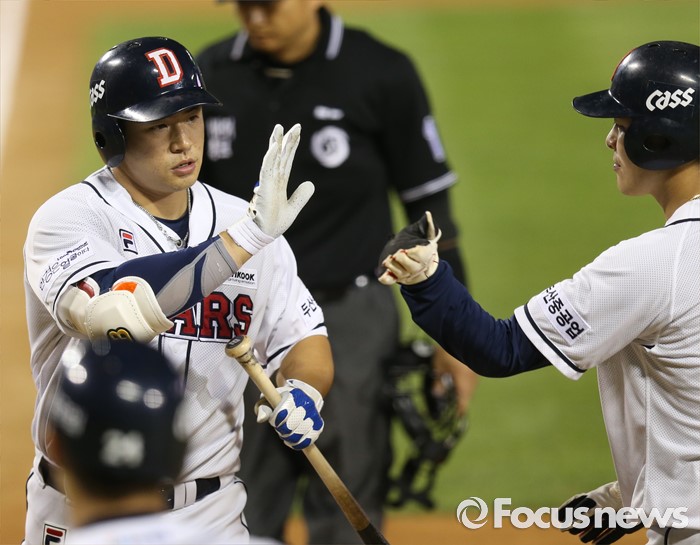 (서울=포커스뉴스) 29일 서울 잠실구장에서 열린 2016 프로야구 NC-두산 경기 6회말 두산 김재환이 3점 홈런을 치고 홈인하며 민병헌과 하이파이브하고 있다.