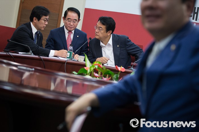 (서울=포커스뉴스) 정진석(왼쪽 세번째) 새누리당 원내대표와 방명재 사무총장, 김영우(왼쪽 두번째) 비대위원이 30일 오전 서울 여의도 당사에서 혁신비상대책위원회의를 하고 있다.