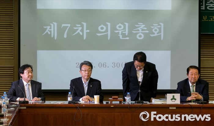 (서울=포커스뉴스) 30일 오전 서울 여의도 국회 의원회관에서 열린 국민의당 의원총회에 참석한 박지원(오른쪽 두번째) 비대위원장이 인사하고 있다.