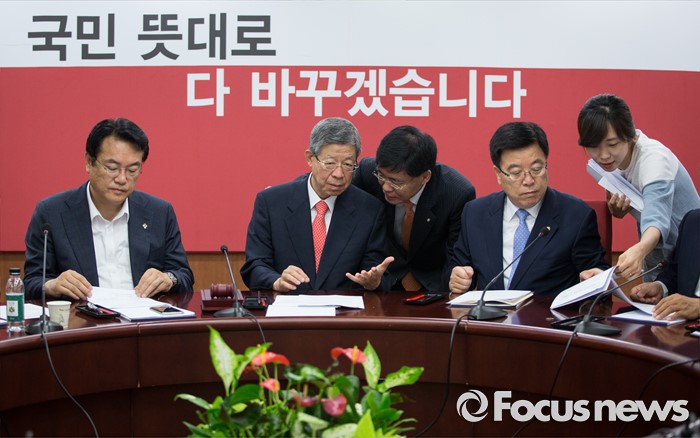 (서울=포커스뉴스) 30일 오전 서울 여의도 새누리당 당사에서 김희옥 혁신비대위원장을 비롯한 혁신위원들이 회의를 하고 있다. 왼쪽부터 정진석 원내대표, 김희옥 혁신비대위원장.