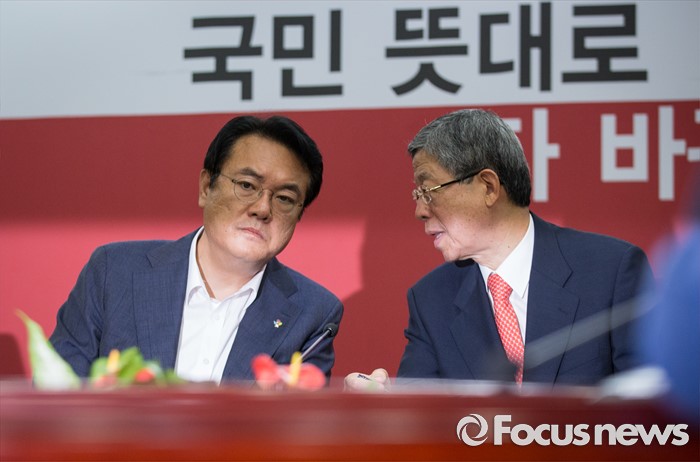 (서울=포커스뉴스) 김희옥(오른쪽) 새누리당 혁신비대위원장과 정진석 원내대표가 30일 오전 서울 여의도 당사에서 혁신비상대책위원회의를 하고 있다.