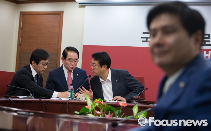 (서울=포커스뉴스) 정진석(왼쪽 세번째) 새누리당 원내대표와 방명재 사무총장, 김영우(왼쪽 두번째) 비대위원이 30일 오전 서울 여의도 당사에서 혁신비상대책위원회의를 하고 있다.