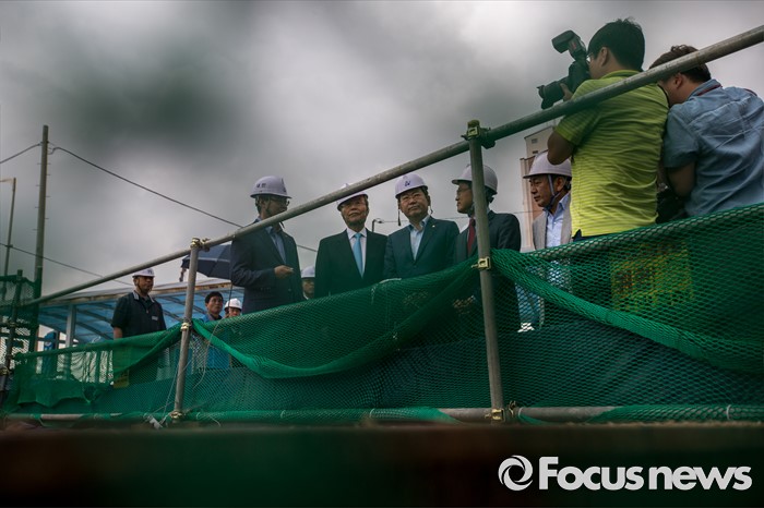 (서울=포커스뉴스) 김종인 더불어민주당 비상대책위 대표가 30일 오전 서울 용산구 한강로 빗물펌프장을 방문해 공사현장을 둘러 보고 있다.