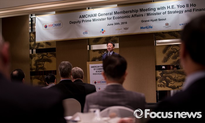 (서울=포커스뉴스) 유일호 경제부총리 겸 기획재정부 장관이 30일 오후 서울 용산구 그랜드하얏트 서울에서 열린 주한미국상공회의소 초청 오찬간담회에 참석해 기조연설을 하고 있다.
