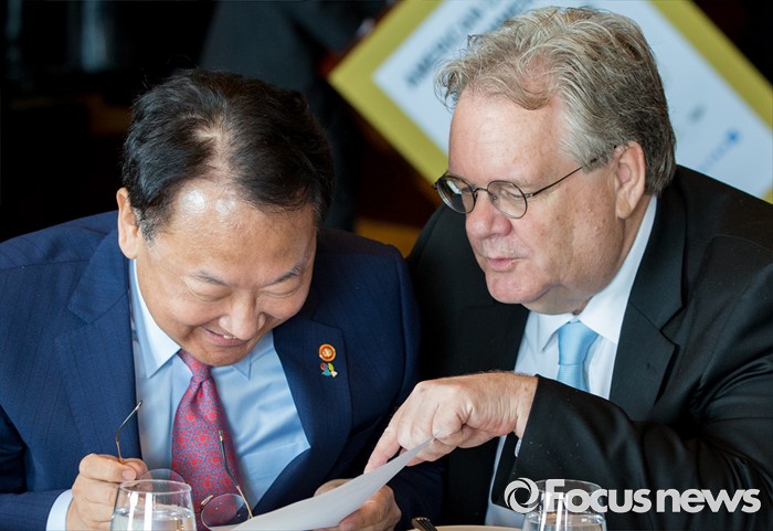 (서울=포커스뉴스) 유일호 경제부총리 겸 기획재정부 장관이 30일 오후 서울 용산구 그랜드하얏트 서울에서 열린 주한미국상공회의소 초청 오찬간담회에 참석해 제프리 존스 암참 미래의 동반자재단 이사장과 대화하고 있다.
