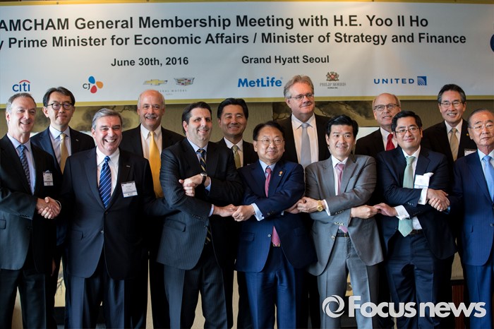 (서울=포커스뉴스) 유일호 경제부총리 겸 기획재정부 장관이 30일 오후 서울 용산구 그랜드하얏트 서울에서 열린 주한미국상공회의소 초청 오찬간담회에 참석해 암참 회원들과 기념촬영 하고 있다.