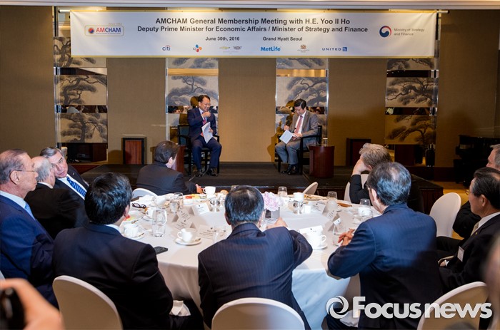 (서울=포커스뉴스) 유일호 경제부총리 겸 기획재정부 장관이 30일 오후 서울 용산구 그랜드하얏트 서울에서 열린 주한미국상공회의소 초청 오찬간담회에 참석해 기조연설을 하고 있다.