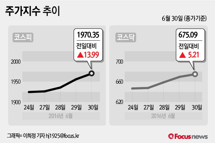 (서울=포커스뉴스) 30일 코스피지수는 전날보다 0.72%(13.99포인트) 오른 1970.35에 장을 마쳤다. 코스닥지수는 전일 대비 0.78%(5.21포인트) 오른 675.09에 마감했다.