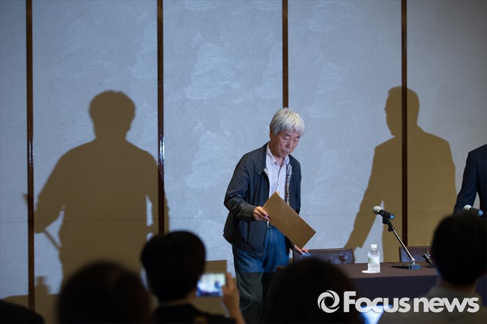 (서울=포커스뉴스) 위작 논란에 휩싸인 이우환 화백이 30일 오후 서울 중구 웨스틴조선 호텔에서 기자회견에 참석하고 있다.