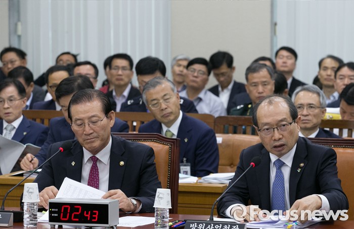(서울=포커스뉴스) 30일 오후 서울 여의도 국회에서 열린 국방위원회 전체회의에 참석한 장명진 방위사업청장이 의원들의 질의에 답하고 있다. 왼쪽은 박창명 병무청장.