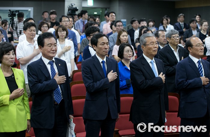 (서울=포커스뉴스) 30일 오후 서울 여의도 국회 의원회관에서 열린 더불어민주당 건강보험 부과체계 개편안 공청회에 참석한 김종대(오른쪽부터) 정책위부의장, 김종인 비대위 대표, 우상호 원내대표, 변재일 정책위의장, 남인순 의원이 국기에 대한 경례를 하고 있다.
