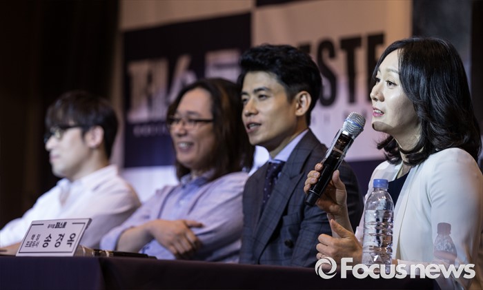 (서울=포커스뉴스) 30일 오후 서울 성동구 디노체 컨벤션에서 열린 뮤지컬 '페스트' 제작발표회 참석한 송경옥(오른쪽) 책임 프로듀서가 인사말을 하고 있다.