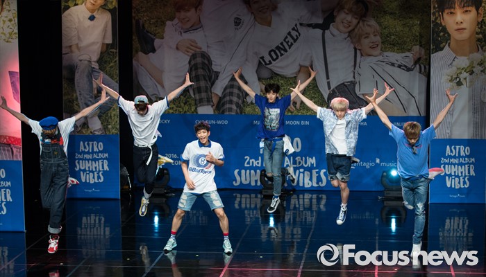 (서울=포커스뉴스) 30일 오후 서울 강남구 일지아트홀에서 열린 아이돌 그룹 아스트로의 두번째 미니앨범 'Summer Vibes' 발표 쇼케이스에 참여한 멤버들이 신곡무대를 선보이고 있다.