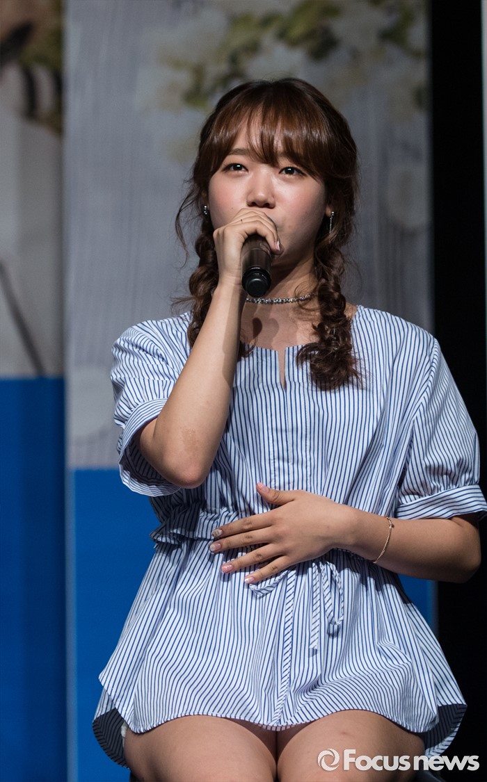 (서울=포커스뉴스) 30일 오후 서울 강남구 일지아트홀에서 열린 아이돌 그룹 아스트로의 두번째 미니앨범 'Summer Vibes' 발표 쇼케이스에 참여한 걸그룹 IOI의 멤버 최유정이 인사말을 취재진의 질문에 답하고 있다.