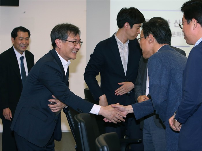 (서울=포커스뉴스) 정관주 문체부 1차관이 30일 서울 종로구 삼청로 국립현대미술관 서울관 회의실에서 열린 ‘산업의 문화화 협의체 1차 회의’에서 참석자들과 인사를 나누고 있다. <사진제공=문화체육관광부>