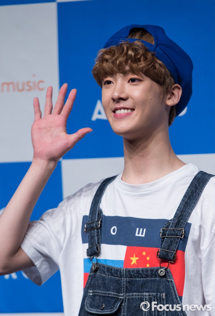 (서울=포커스뉴스) 30일 오후 서울 강남구 일지아트홀에서 열린 아이돌 그룹 아스트로의 두번째 미니앨범 'Summer Vibes' 발표 쇼케이스에 참여한 멤버 윤산하가 포토타임을 갖고 있다.