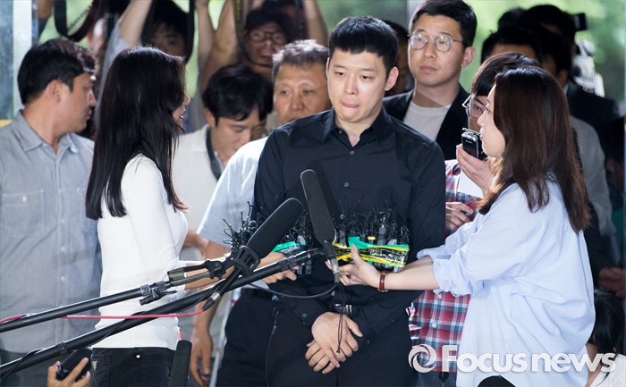 (서울=포커스뉴스) 성폭행 혐의로 4명의 여성에게 연이어 피소된 가수 겸 배우 박유천이 30일 오후 서울 강남경찰서로 출석하고 있다.