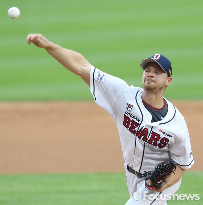 (서울=포커스뉴스) 30일 서울 잠실구장에서 열린 2016 프로야구 NC-두산 경기에서 1회초 두산 선발투수 보우덴이 투구하고 있다.