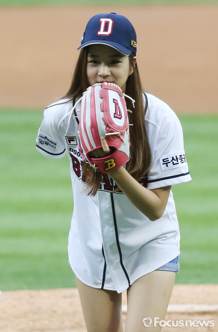 (서울=포커스뉴스) 30일 서울 잠실구장에서 열린 2016 프로야구 NC-두산 경기에 앞서 걸그룹 '라붐'의 솔빈이 시구하고 있다.