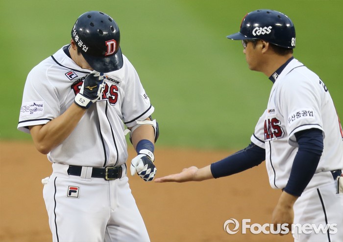 (서울=포커스뉴스) 30일 서울 잠실구장에서 열린 2016 프로야구 NC-두산 경기 2회말 2사 1,2루에서 두산 김재호가 1타점 2루 강습 안타를 치고 유니폼의 옷깃에 키스하고 있다.