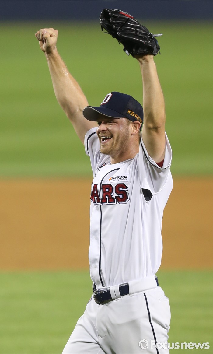 (서울=포커스뉴스) 30일 서울 잠실구장에서 열린 2016 프로야구 NC-두산 경기에서 두산 투수 보우덴이 9이닝 동안 139구를 던지며 KBO리그 역대 13번째 노히트노런을 달성하며 시즌 10승 고지에 올랐다. NC 마지막 타자 나성범을 삼진 아웃시키고 두 손을 번쩍 들며 환호하고 있다.