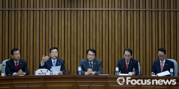 (서울=포커스뉴스) 김광림 새누리당 정책위의장이 1일 오전 서울 여의도 국회열린 원내대책회의에서 발언하고 있다. 왼쪽 두번째부터 김 위의장, 정진석 원내대표, 박명재 사무총장, 김도읍 원내수석부대표
