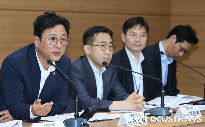(세종=포커스뉴스) 이정섭 환경부 차관이 1일 오전 세종시 정부세종청사 6동 브리핑룸에서 미세먼지 관리 특별대책 세부이행계획을 발표하고 있다. 정부는 브리핑에서 2020년까지 친환경차 보급에 3조원, 충전인프라에 7600억원, 노후경유차 조기폐차에 1800억원을 투자하고 금년 7월중 에너지상대가격 조정 연구 착구, 석탄화력발전도 미세먼지 저감대책 발표, 노후경유차 수도권 운행제한 시행 방안 확정 등 핵심대책의 구체와 및 일정단축 등을 주요내용으로 발표했다. 왼쪽부터 이정섭 차관, 박광열 해양수산부 해사안전국장, 나정균 환경부 기후대기정책관, 김진우 미래창조과학부 원천기술과장.