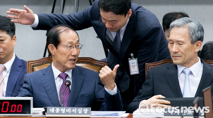 (서울=포커스뉴스) 1일 오전 서울 여의도 국회에서 열린 운영위원회 전체회의에 참석한 이원종(왼쪽) 대통령비서실장이 관계자와 대화하고 있다. 오른쪽은 김관진 국가안보실장.
