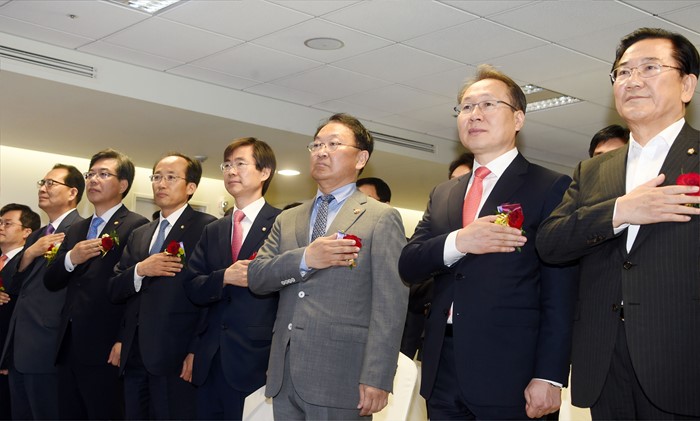 (서울=포커스뉴스) 유일호 부총리 겸 기획재정부 장관이 1일 서울 메트로타워에서 열린 한국재정정보원 개원식에 참석, 참석자들과 국민의례를 하고 있다. <사진제공=기획재정부>