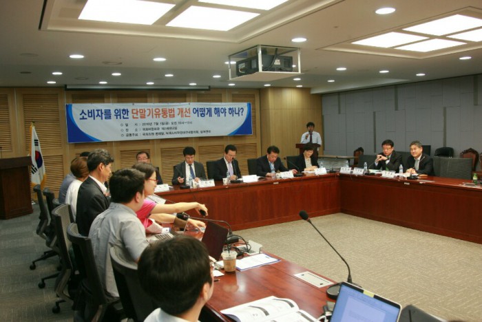 이에 대해 박노익 방통위 이용자정책국장은 “상한제는 실무적인 차원에서 복수의 대안들을 중 하나로 검토된 것”이라며 “1년 밖에 남지 않아 조정을 폐지하기보다는 이해관계자들이 일몰에 대비해서 합리적인 방안들을 준비해야 한다”고 말했다. 또 “다양한 의견들을 수렴해가면서 궁극적으로는 정보통신기술(ICT) 생태계 발전이라는 큰 틀에서 생각해야 하겠다”고 덧붙였다.변재일 의원실이 주최한 단통법 개선논의 토론회에서 패널들이 의견을 주고받고 있다.<사진제공=녹색소비자연대 ICT 소비자정책연구원>