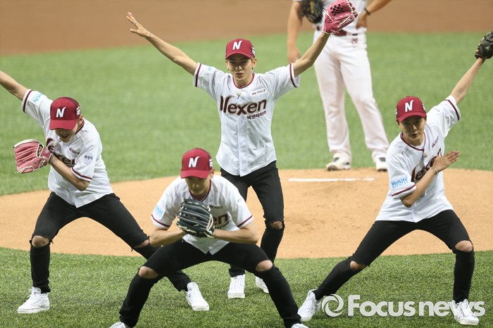 (서울=포커스뉴스) 1일 서울 고척 스카이돔에서 열린 2016 프로야구 KIA-넥센 경기에서 남성 6인조 아이돌그룹 MAP6가 시구하고 있다.