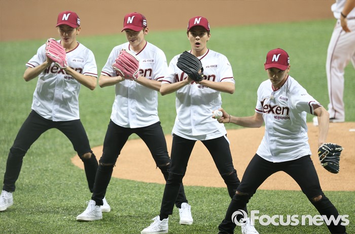 (서울=포커스뉴스) 1일 서울 고척 스카이돔에서 열린 2016 프로야구 KIA-넥센 경기에서 남성 6인조 아이돌그룹 MAP6가 시구하고 있다.