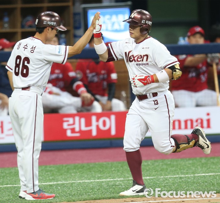 (서울=포커스뉴스) 1일 서울 고척 스카이돔에서 열린 2016 프로야구 KIA-넥센 경기 6회말 1사후 넥센 윤석민이 좌월 솔로 홈런을 치고 3루를 돌며 정수성 코치의 환영을 받고 있다.
