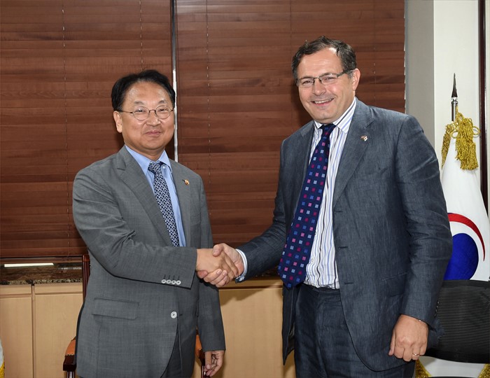 (서울=포커스뉴스) 유일호 부총리 겸 기획재정부 장관이 1일 서울 광화문 정부서울청사에서 찰스 헤이 주한 영국대사와 면담에 앞서 악수하며 인사를 나누고 있다. <사진제공=기획재정부>