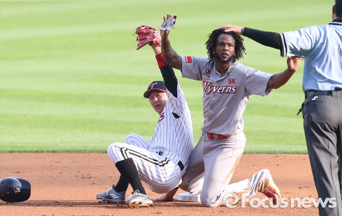(서울=포커스뉴스) 3일 서울 잠실구장에서 열린 2016 프로야구 SK-LG 경기 1회초 초구를 때려 좌중간 안타로 진루한 SK 고메즈가 1사후 김강민 타석때 2루 도루를 시도한 후 최수원 2루심의 세이프 판정을 바라보고 있다. 왼쪽은 LG 2루수 손주인.