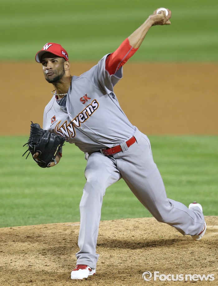 (서울=포커스뉴스) 3일 서울 잠실구장에서 열린 2016 프로야구 SK-LG 경기에서 SK 투수 라라가 6회말 구원 등판해 투구하고 있다.