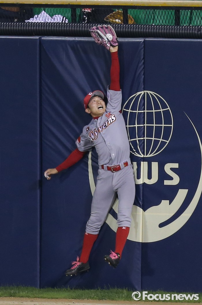 (서울=포커스뉴스) 3일 서울 잠실구장에서 열린 2016 프로야구 SK-LG 경기 8회말 1사 1,2루에서 SK 우익수 김재현이 LG 정성훈의 타구를 펜스에 부딪히며 잡아내고 있다.
