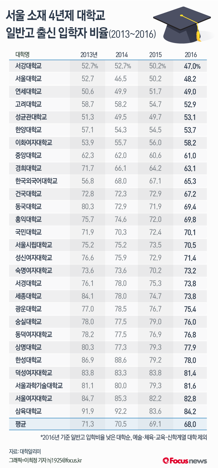 | △ [그래픽] 서울소재 4년제 대학교 일반고 출신 입학자 비율(2013~2016) |
