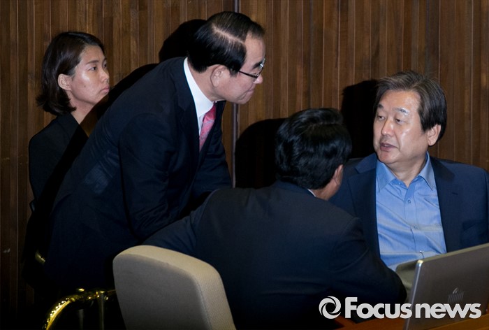 (서울=포커스뉴스) 4일 오전 서울 여의도 국회에서 열린 343회 국회(임시회) 6차 본회의, 경제에 관한 대정부 질문에 참석한 박명재(왼쪽부터) 새누리당 사무총장, 정진석 원내대표, 김무성 전 대표가 대화하고 있다.