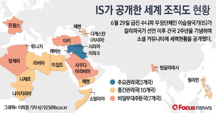 (서울=포커스뉴스) 6월 29일 급진 수니파 무장단체인 이슬람국가(IS)가 칼리파국가 선언 이후 건국 2주년을 기념하며 소셜 커뮤니티에 세력현황을 공개했다.