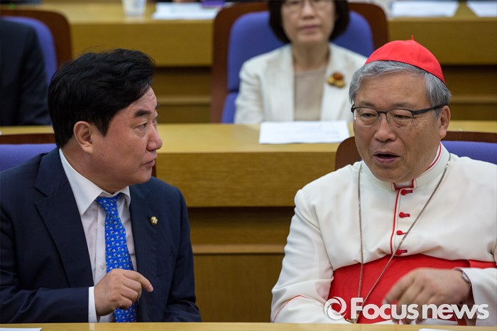 (서울=포커스뉴스) 염수정(오른쪽) 추기경과 이석현 더불어민주당 의원이 4일 오전 서울 여의도 국회의원회관에서 열린 '생명존중포럼 창립총회'에 참석해 대화 하고 있다.