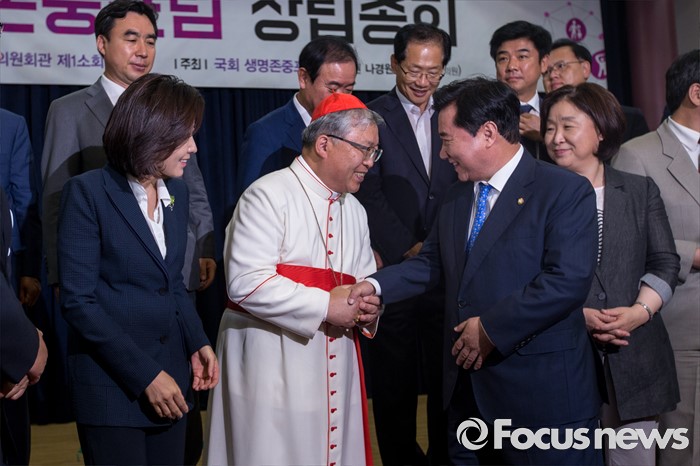 (서울=포커스뉴스) 염수정(왼쪽 두 번째) 추기경과 이석현(오른쪽 두 번째) 더불어민주당 의원이 4일 오전 서울 여의도 국회의원회관에서 열린 '생명존중포럼 창립총회'에 참석해 행사를 마친 뒤 악수 하고 있다.