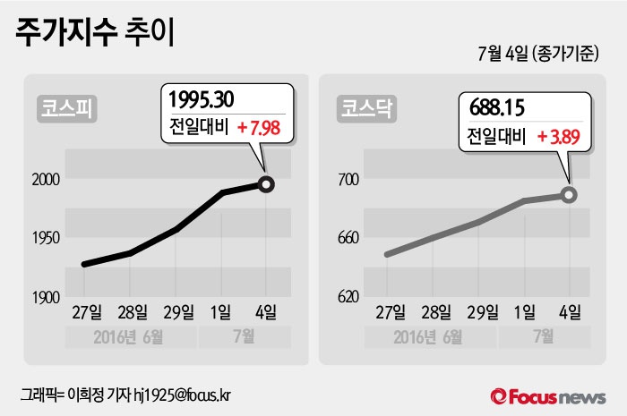 (서울=포커스뉴스) 4일 코스피지수는 전날보다 0.40%(7.98포인트) 오른 1995.30에 장을 마쳤다. 코스닥지수는 전일 대비 0.57%(3.89포인트) 오른 688.15에 마감했다.