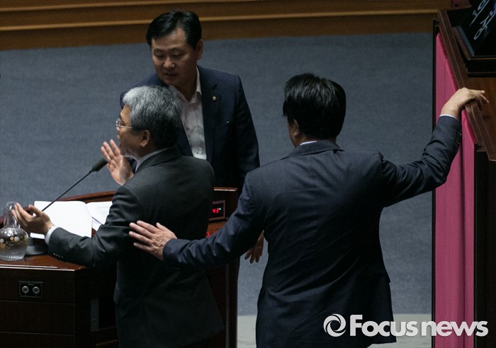 (서울=포커스뉴스) 5일 오전 서울 여의도 국회에서 열린 343회 국회(임시회) 7차 본회의, 정치·외교·통일·안보·교육·사회·문화에 관한 질문에 참석한 이장우 새누리당 의원 등과 김동철 국민의당 의원이 언쟁을 벌이자 정진석 새누리당 원내대표, 김관영 국민의당 원내수석부대표가 김동철 의원을 만류하고 있다.