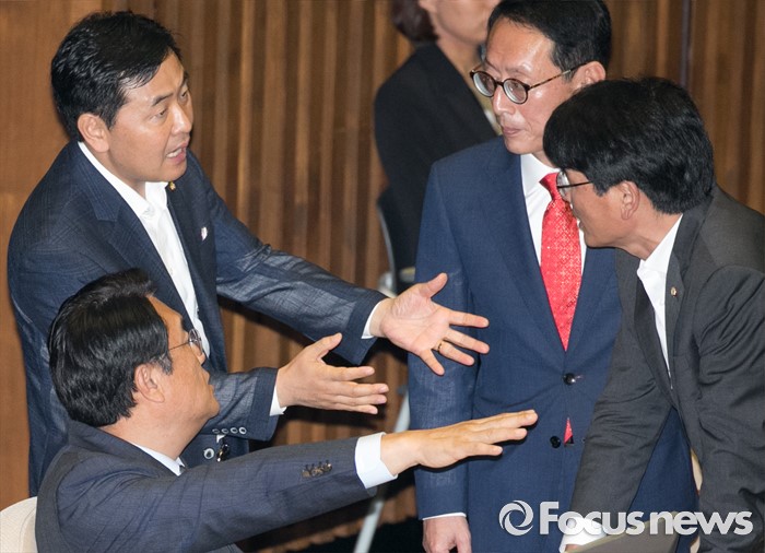(서울=포커스뉴스) 5일 오전 서울 여의도 국회에서 열린 343회 국회(임시회) 7차 본회의, 정치·외교·통일·안보·교육·사회·문화에 관한 질문에 참석한 정진석(왼쪽 첫번째) 새누리당 원내대표, 김도읍(오른쪽 두번째) 원내수석부대표, 박완주(오른쪽 첫번째) 더불어민주당 원내수석부대표, 김관영 국민의당 원내수석부대표가 김동철 국민의당 의원과 이장우 새누리당 의원 등의 언쟁과 관련 논의하고 있다.